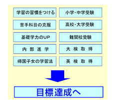 又同じ箇所でつまづいている生徒でも、そこが解からない原因は、基礎学力の不足であったり、応用力の定着不足であったりと様々です。そこで、生徒1人1人が 目標達成の為に、解かる所までどこまでも戻ってきちんと解決してゆきます。そして解決したらどんどん先へ進み、各生徒に合わせた学習進度で目標までの最短コースを目指します。