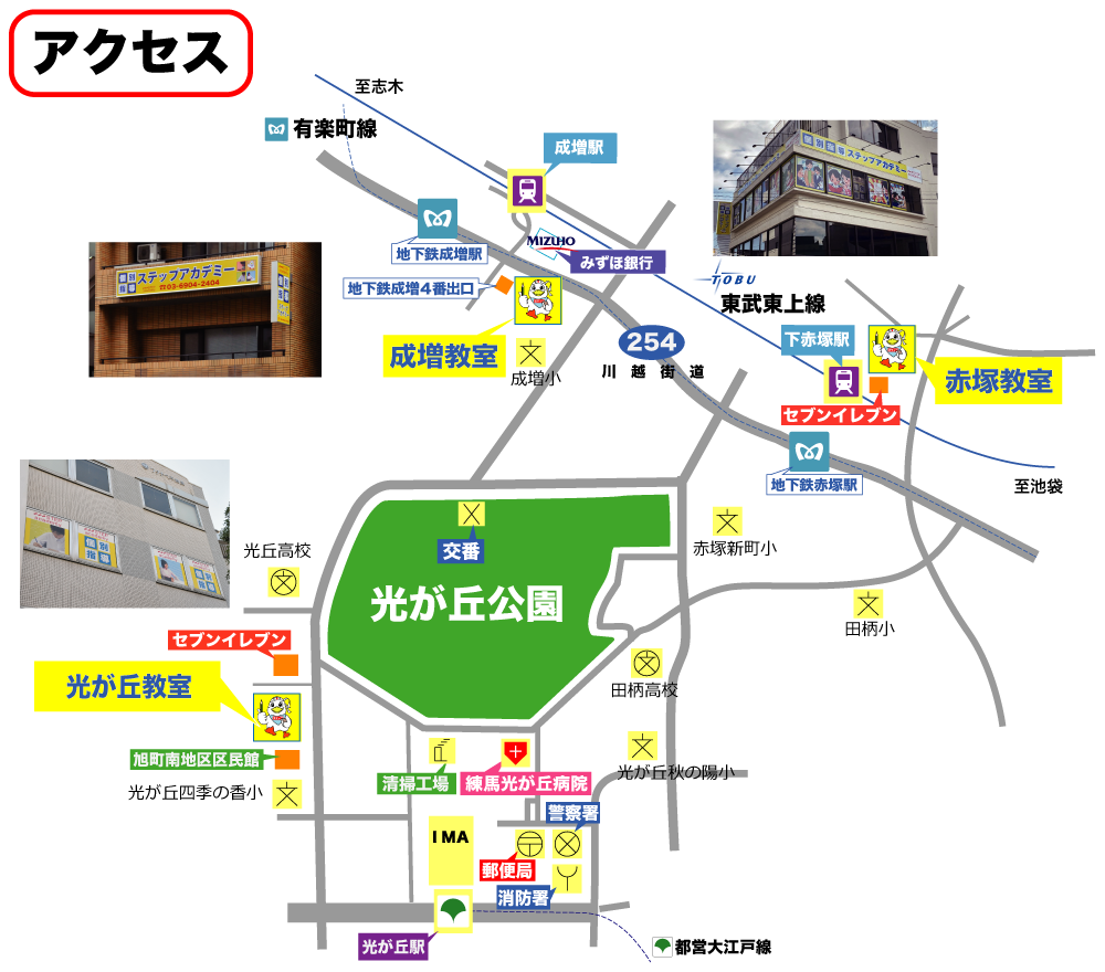 | 勤務地 | 下記3教室のいずれか ※オンラインの場合も各教室にて 【光が丘教室】 〒 179-0071 東京都練馬区旭町1-15-29 光が丘ワタナベ不動産ビル3F 【赤塚教室】 〒175-0092 東京都板橋区赤塚2-1-9 パンダビル2 3F 【成増教室】 〒 175-0094 東京都板橋区成増1-13-11 ファーイ―ストビル 2F |